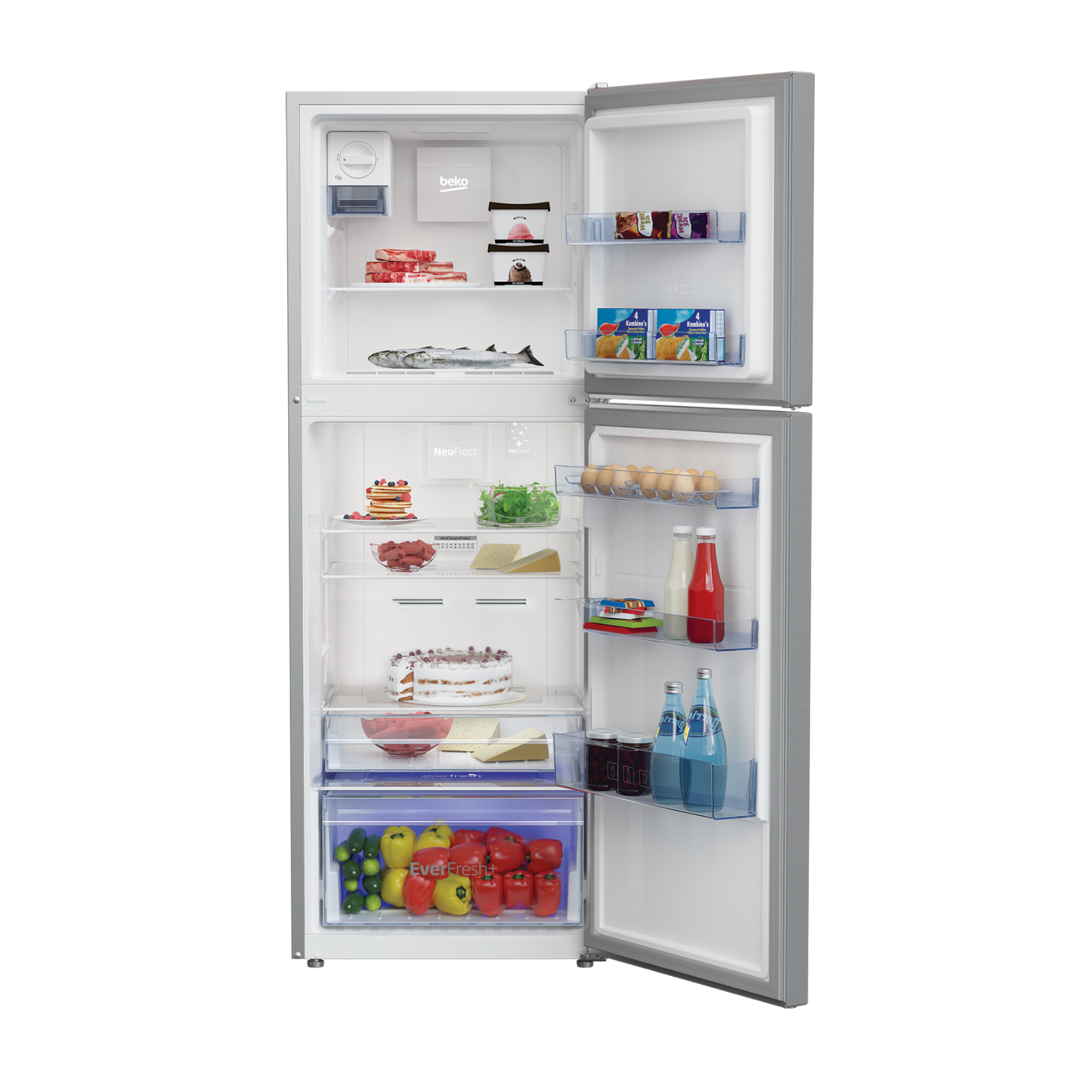 ثلاجة مجمدة Beko RDNT340I50VZX بسعة 340 لترًا، مع NeoFrost Dual Cooling لمنع انتقال الروائح، EverFresh+ وActive Fresh Blue Light لإطالة عمر الخضروات 30 يومًا، ProSmart Inverter لتبريد هادئ وكفء، وفلتر Active Odour Filter. مناسبة للعائلات المتوسطة، بتصميم إينوكس أنيق وNo-Frost.