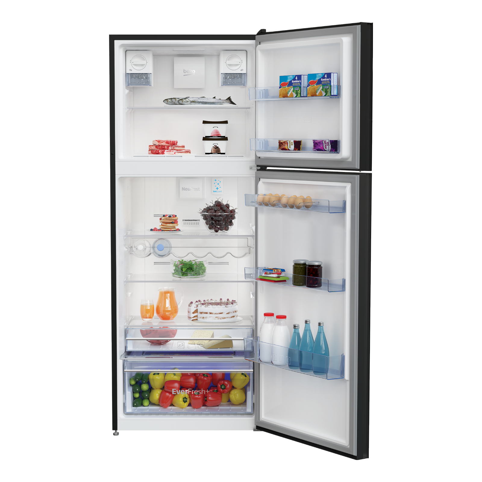 ثلاجة مجمدة Beko RDNT470E50VZGB بسعة 470 لترًا، مع NeoFrost Dual Cooling لتدفق هواء منفصل، EverFresh+ وActive Fresh Blue Light للحفاظ على الخضروات 30 يومًا، ProSmart Inverter لتبريد كفء وهادئ، وفلتر Active Odour Filter. مثالية للعائلات، بتصميم زجاجي أسود أنيق وNo-Frost.