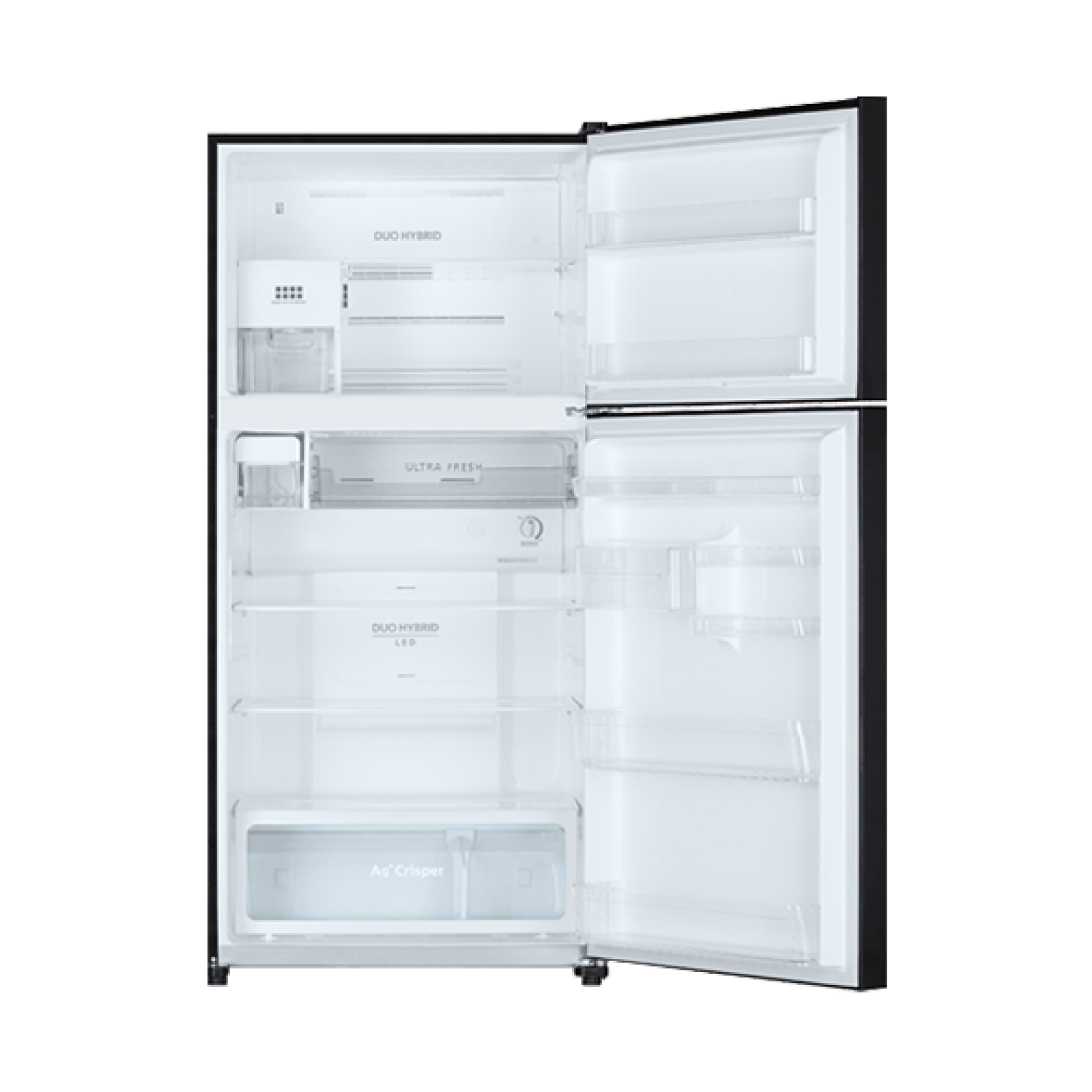 صانع الثلج الأوتوماتيكي مدمج في الفريزر، ينتج ثلجاً نقياً بكميات كبيرة مع آلية إفراج بسيطة، بينما يدعم وضع التجميد السريع تجميد الأطعمة في دقائق للحفاظ على القيمة الغذائية، ووضع التبريد الإضافي في Ultra Fresh Zone للمنتجات الحساسة مثل اللحوم والأسماك عند -3 درجة مئوية لمدة أسبوع دون تجميد. الإضاءة LED اللامعة توفر إضاءة كاملة داخل جميع الحجرات دون استهلاك إضافي للطاقة. الفريزر السفلي واسع مع أدراج متعددة قابلة للتنظيم، والحجرة الرئيسية تشمل رفوف زجاجية قوية قابلة للضبط، بالإضافة إلى صندوق متعدد الاستخدامات (Multi-purpose Utility Box).