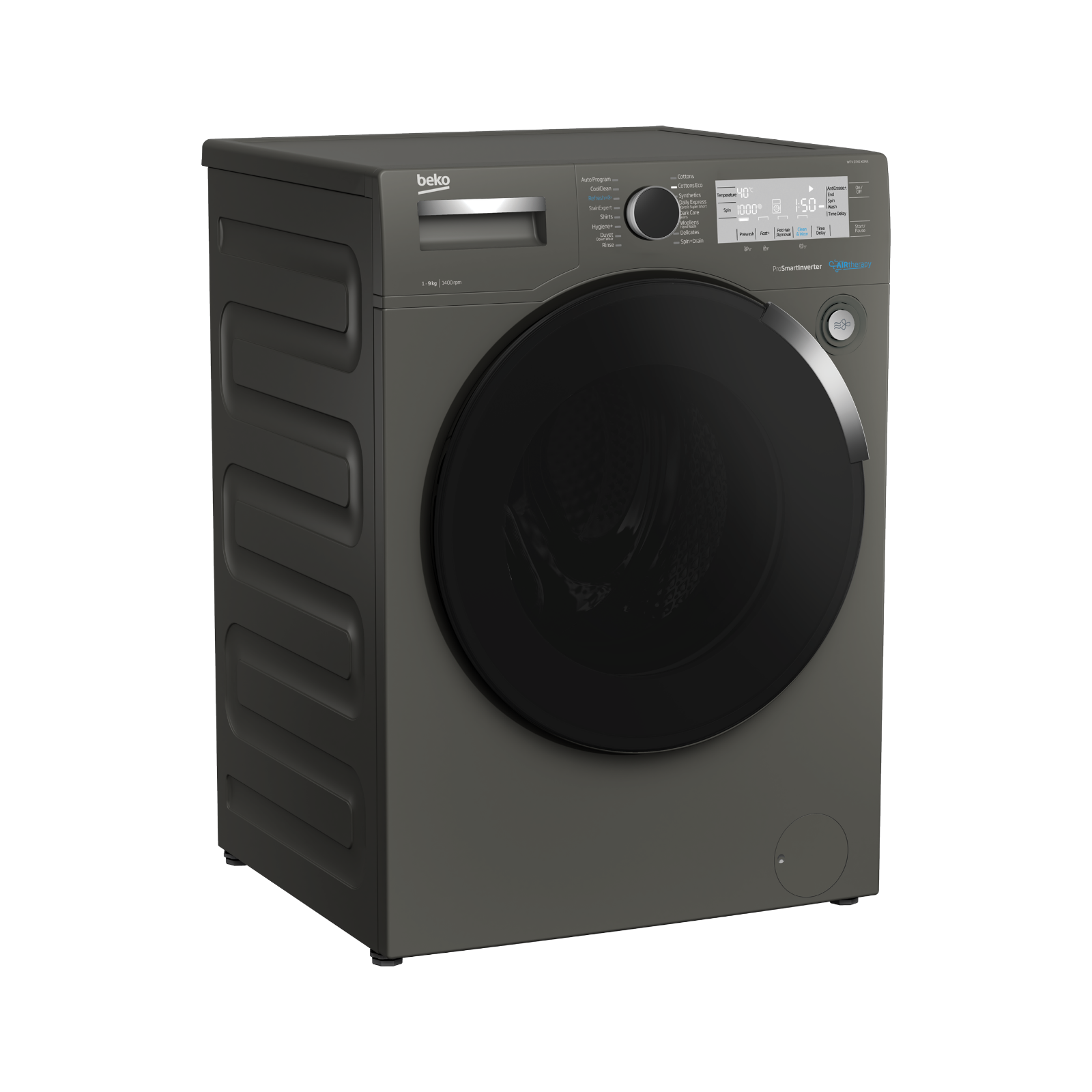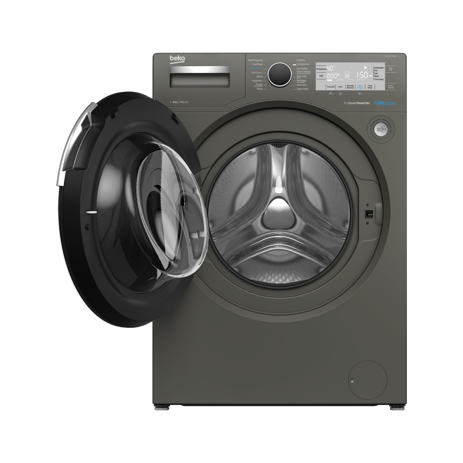 غسالة Beko WTV 9745 X0MA هي غسالة أمامية بسعة 9 كيلوغرام بلون مانهاتن غراي. تتميز بتقنية AirTherapy الفريدة التي توفر تهوية دافئة لتجفيف الملابس جزئياً ومنع التجاعيد. تحتوي على محرك ProSmart العاكس الموفّر للطاقة وبرنامج StainExpert لإزالة 24 نوعاً من البقع. كما تضم برنامج غسيل سريع لـ2 كغم في 14 دقيقة ووظيفة إزالة شعر الحيوانات الأليفة.