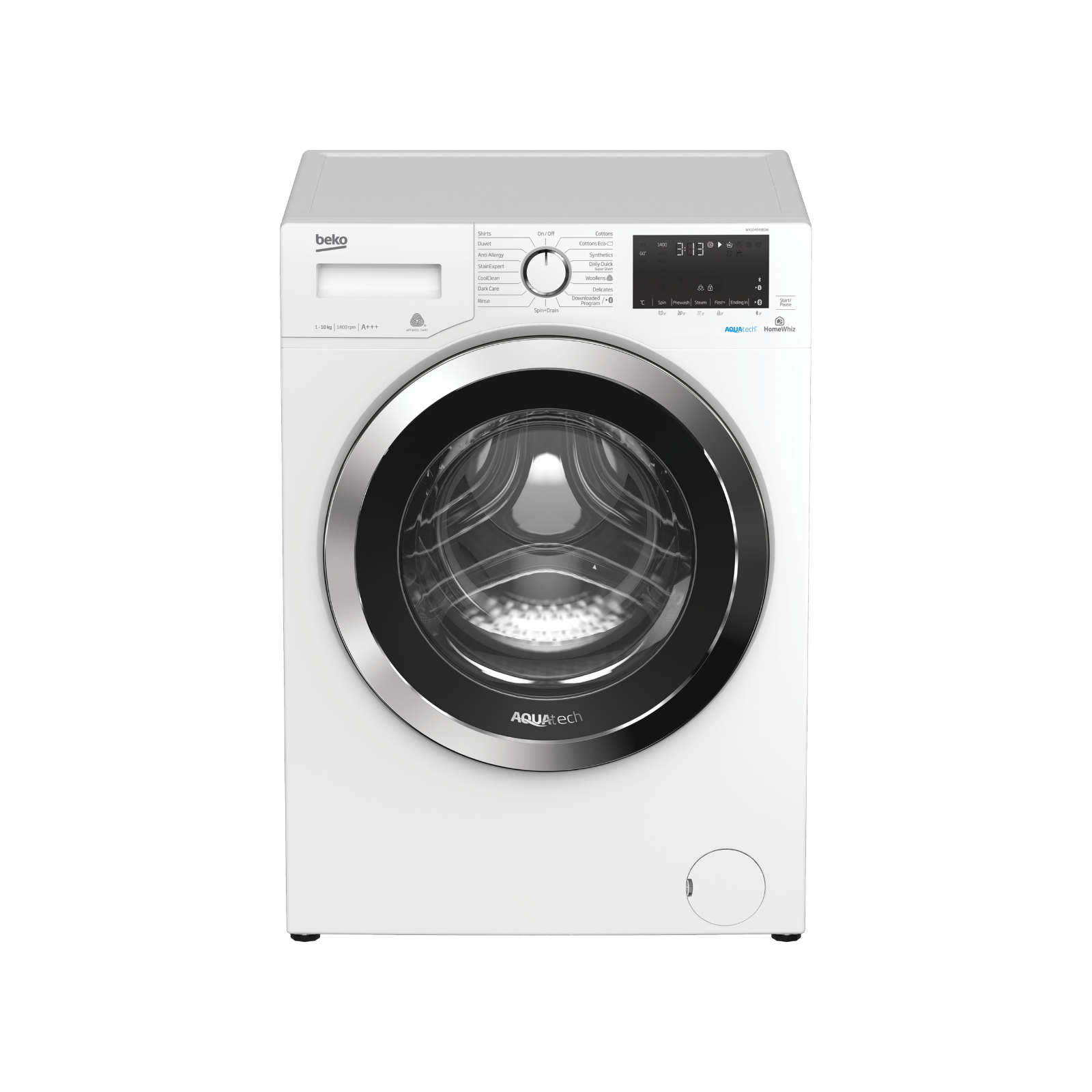 غسالة Beko WX104044E0W هي غسالة أمامية حرة الوقوف بسعة 10 كيلوغرام. تتميز بمحرك ProSmart العاكس الذي يضمن كفاءة عالية في استهلاك الطاقة مع متانة طويلة الأمد. تحتوي على تقنية SteamCure البخارية التي تعالج البقع وتقلل التجاعيد قبل الغسيل، وبرنامج StainExpert لإزالة 24 نوعاً من البقع المختلفة. كما تأتي ببرنامج Xpress Super Short لغسل 2 كغم من الملابس في 14 دقيقة فقط. الغسالة تدعم تقنية HomeWhiz للتحكم عن بعد عبر البلوتوث، وتوفر كفاءة طاقية عالية تصل إلى 20% أكثر من فئة A+++.