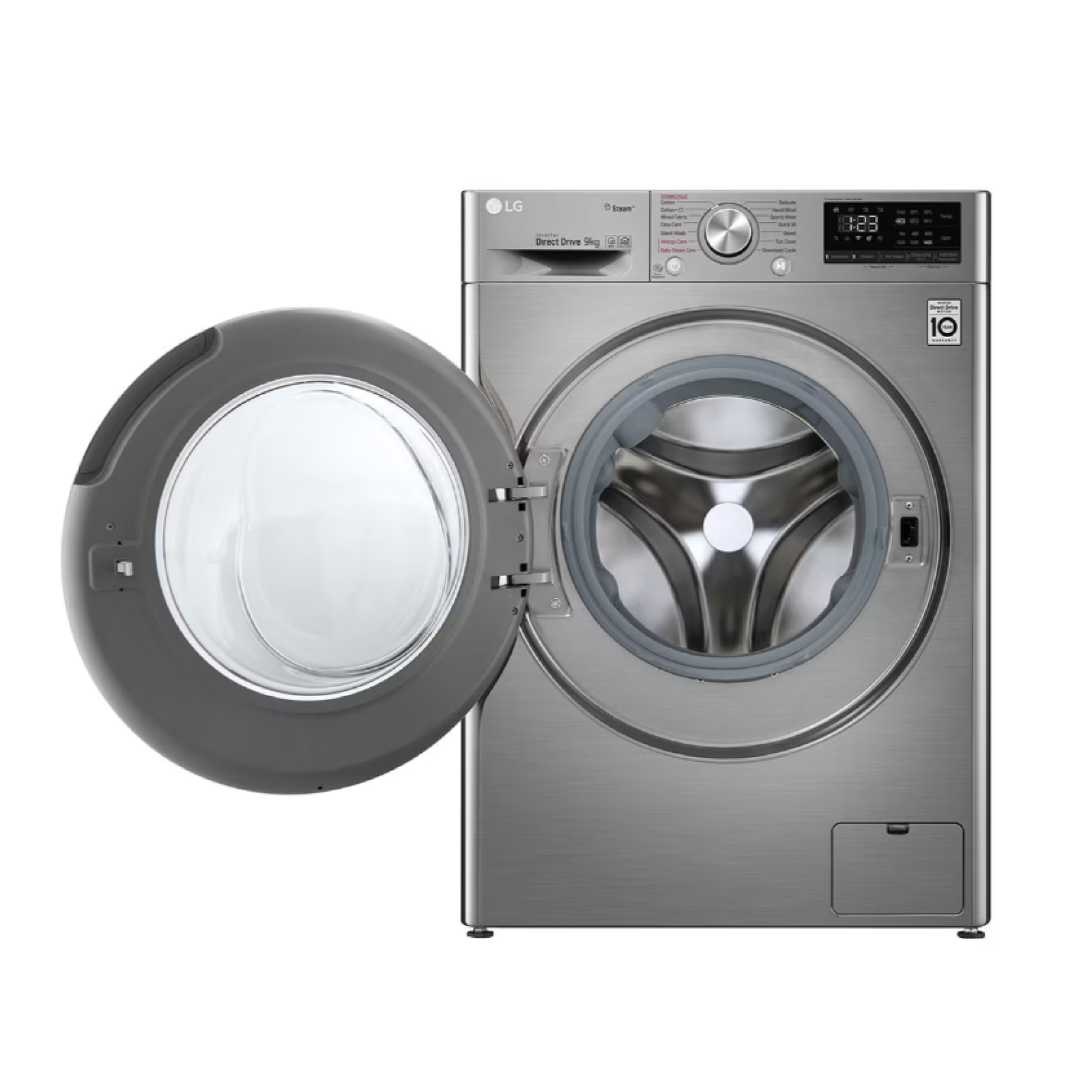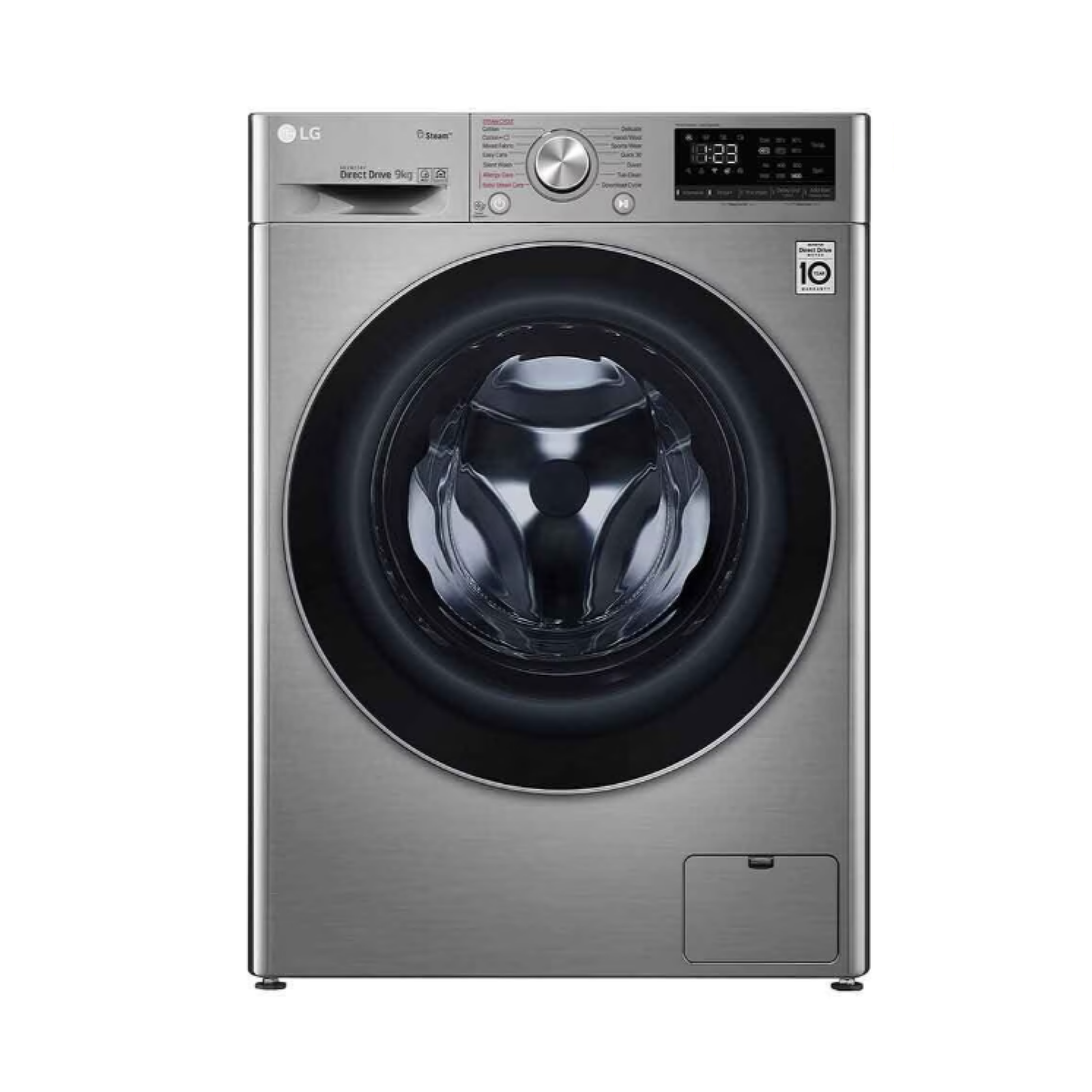 غسالة أمامية بسعة 9 كجم مع AI DD™ لكشف نوع القماش وتحسين الحركة، Steam لإزالة الحساسية، ThinQ™ للتحكم عن بعد. محرك Inverter Direct Drive هادئ (53 ديسيبل غسيل، 71 عادم)، 1400 دورة، 6 Motion لتنظيف عميق، TurboWash 39 دقيقة. مثالية للعائلات مع برامج متنوعة وتوفير طاقة.
